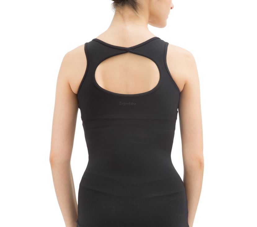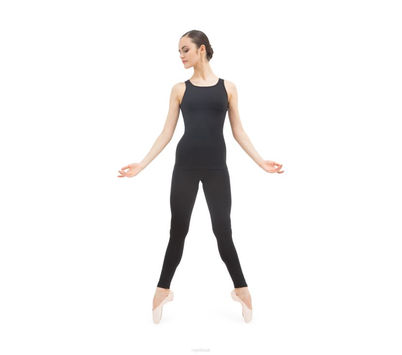 Long Black Top With Large Straps. Fancy Back. Chest Support. Transfer Of The Repetto Logo. Mat Aspect.